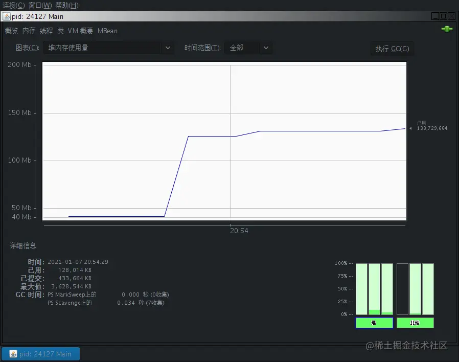 点击按钮等待输出完成后,内存停留在128,014KB,相差15,250KB。