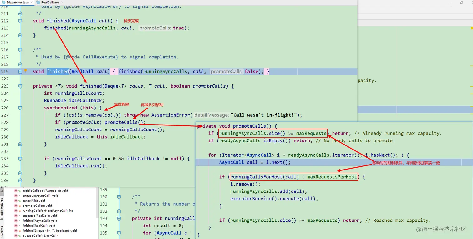 private final Deque<RealCall> runningSyncCalls = new ArrayDeque<>();存储将要运行的请求任务,当运行队列可放入时,从该队列中移动可放入的请求任务