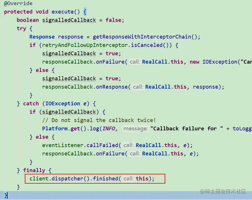 任务执行完成时最终会回调Dispatcher的finished方法