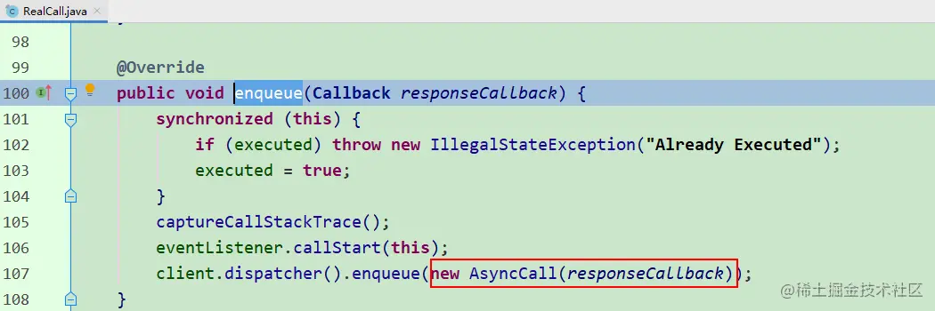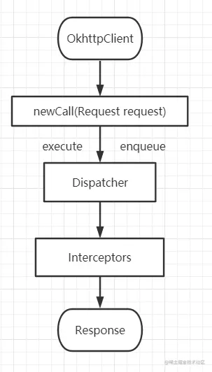 流程简述:OkhttpClient在newCall调用时生成实际的realCall对象,在请求时,通过dispatch去真正安排执行请求。