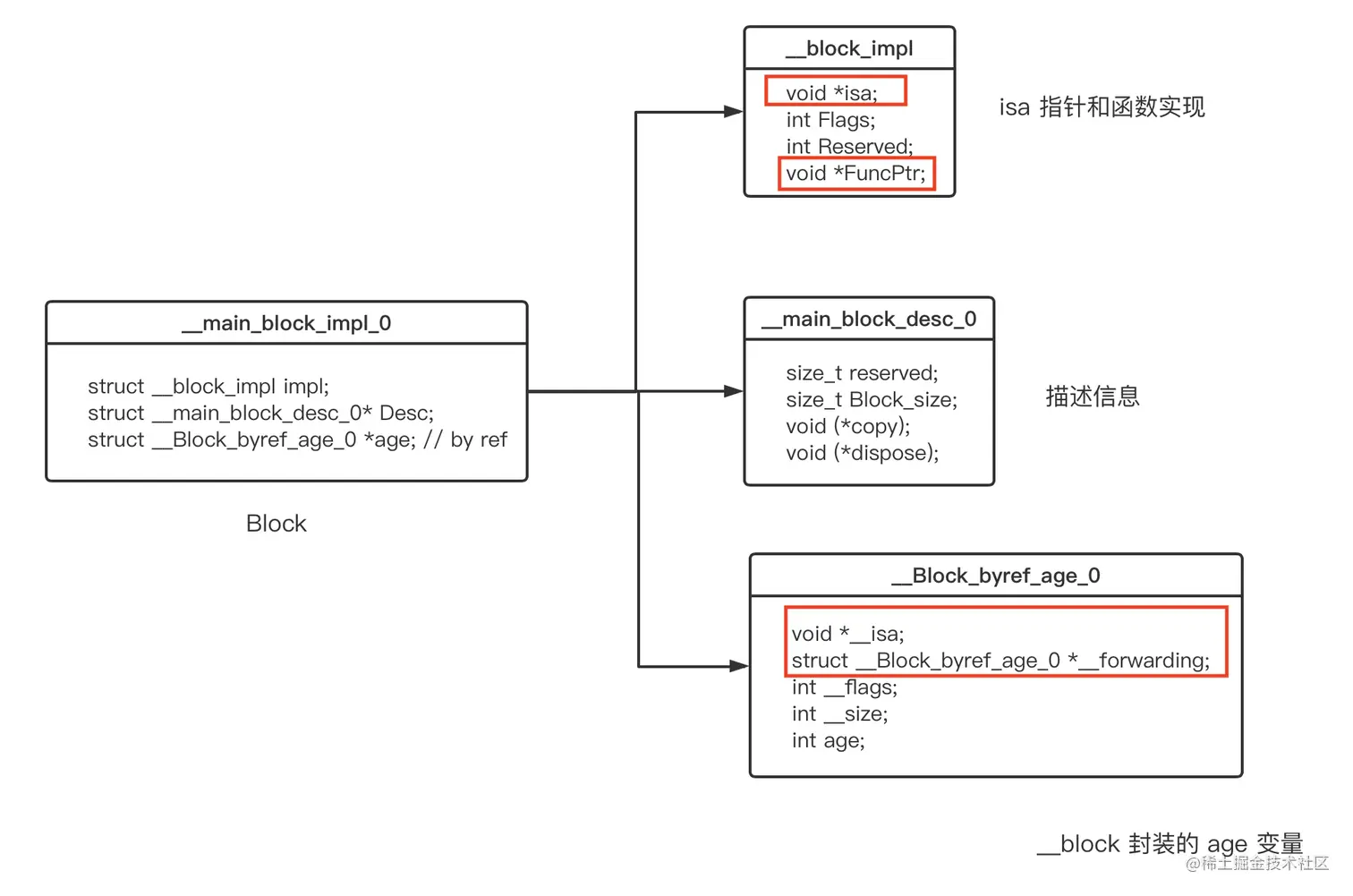 从数据结构可以知道,block 其实就是一个 OC 对象,里面包含 isa 指针,函数调用地址,内存分配大小等信息(当然还可能包含捕获的变量,下面会演示)。