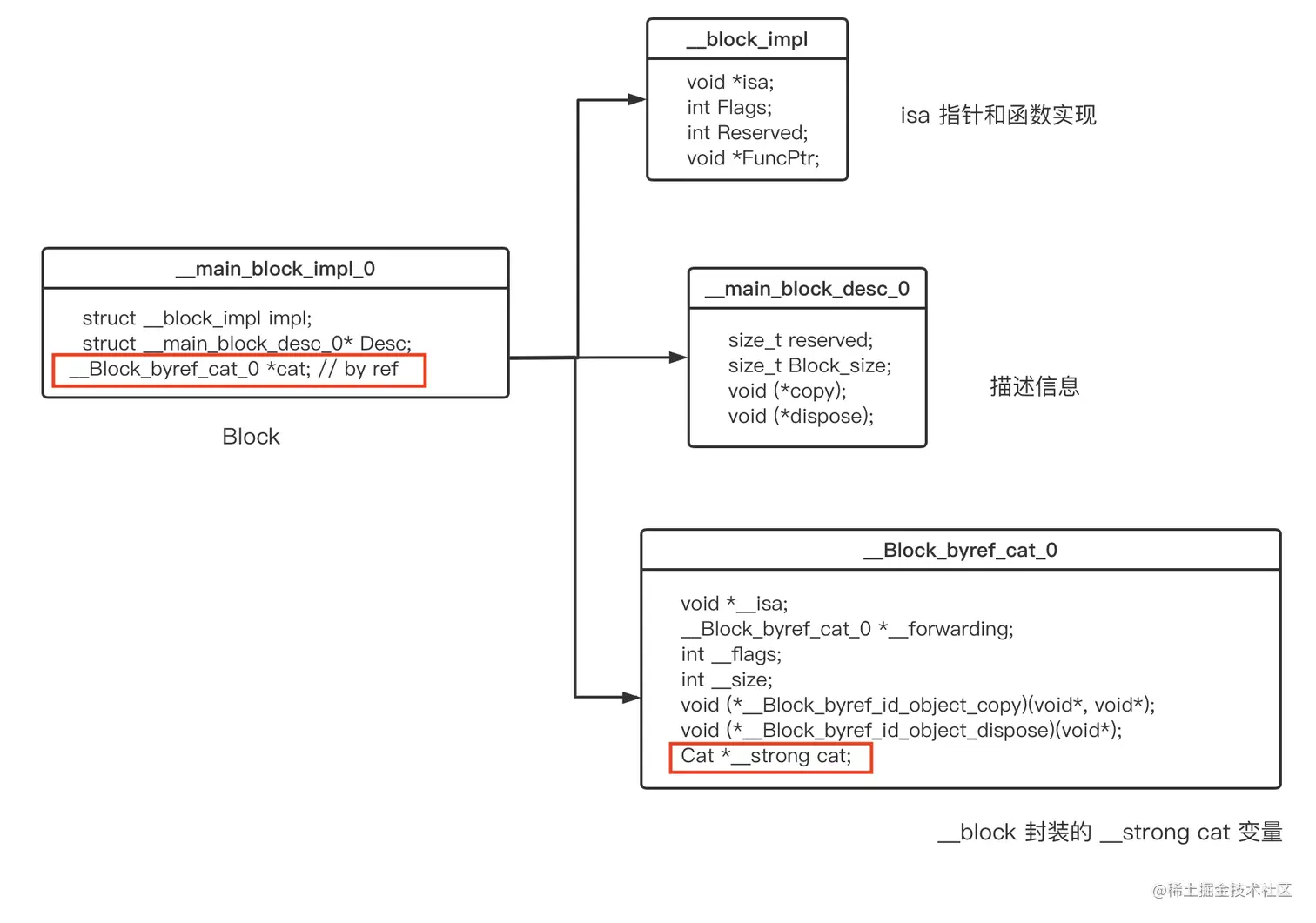 如果声明为:__block __weak Cat *cat = [[Cat alloc] init];,那么就是 __Block_byref_cat_0 弱引用 cat 对象,变成 Cat *__weak cat;