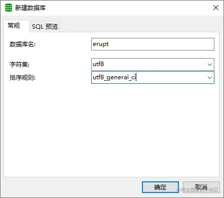 打开 Navicat,连接 MySQL,新建数据库 erupt,设置字符集和排序规则如下图所示: