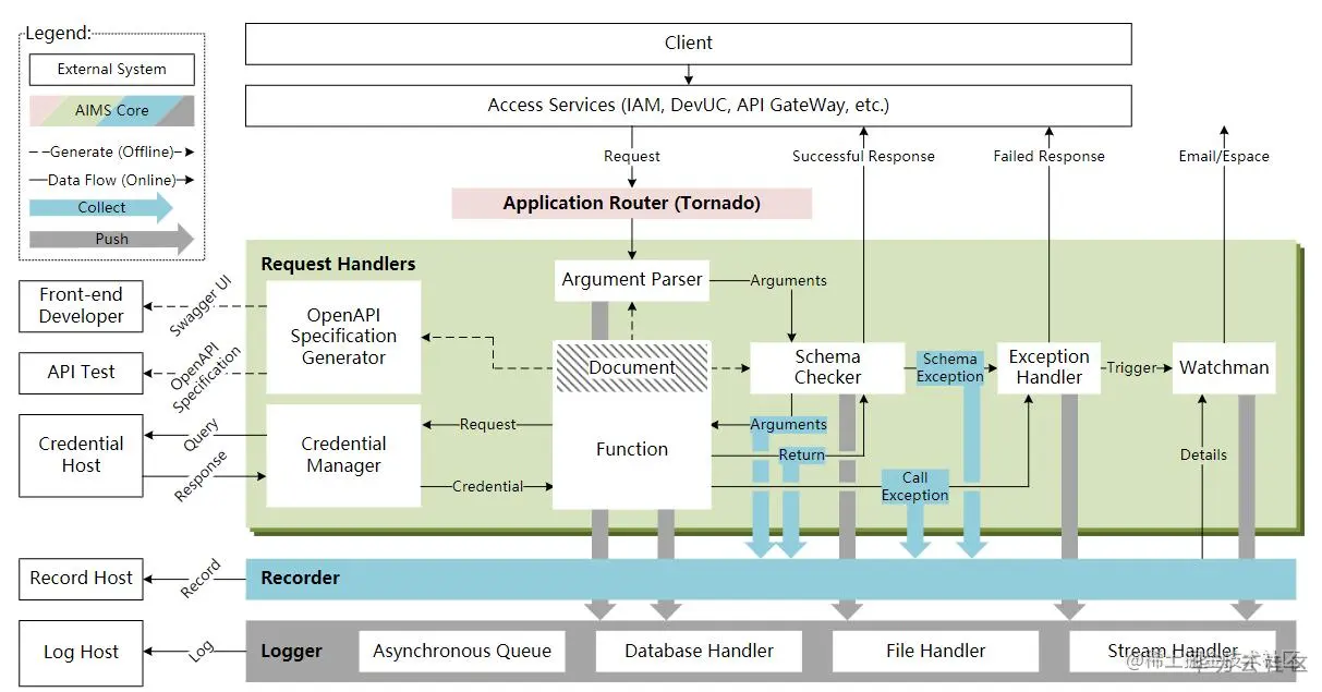 Request Handler处理来自Application Router的响应,是AIMS架构的核心,而Document则是Request Handler的核心。在AIMS架构中,Document是指函数的文档,即__doc__。Request Handler是在服务的启动阶段动态生成的。