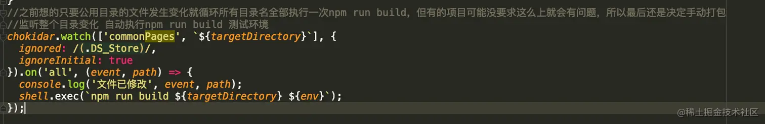 那每次修改运行商场的代码时候我们都要npm run bulid一次然后才能在开发者工具查看吗?这样似乎不合理。之前想的是如果公用的目录发生变化的话就循环一次所有的目录全部执行一次,但这样可能对那些不想修改的商场来说就会有问题,所以最后还是决定手动打包。使用chokidar库监听目录的变化,自动执行代码。