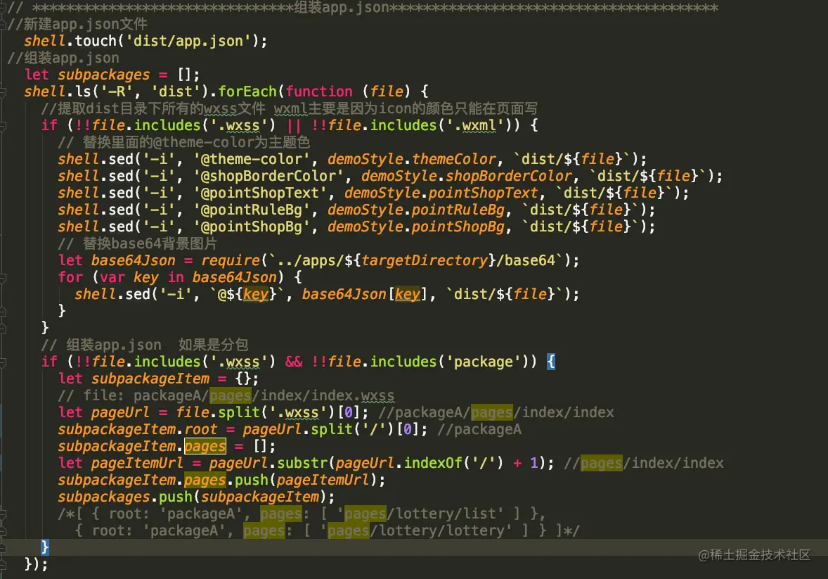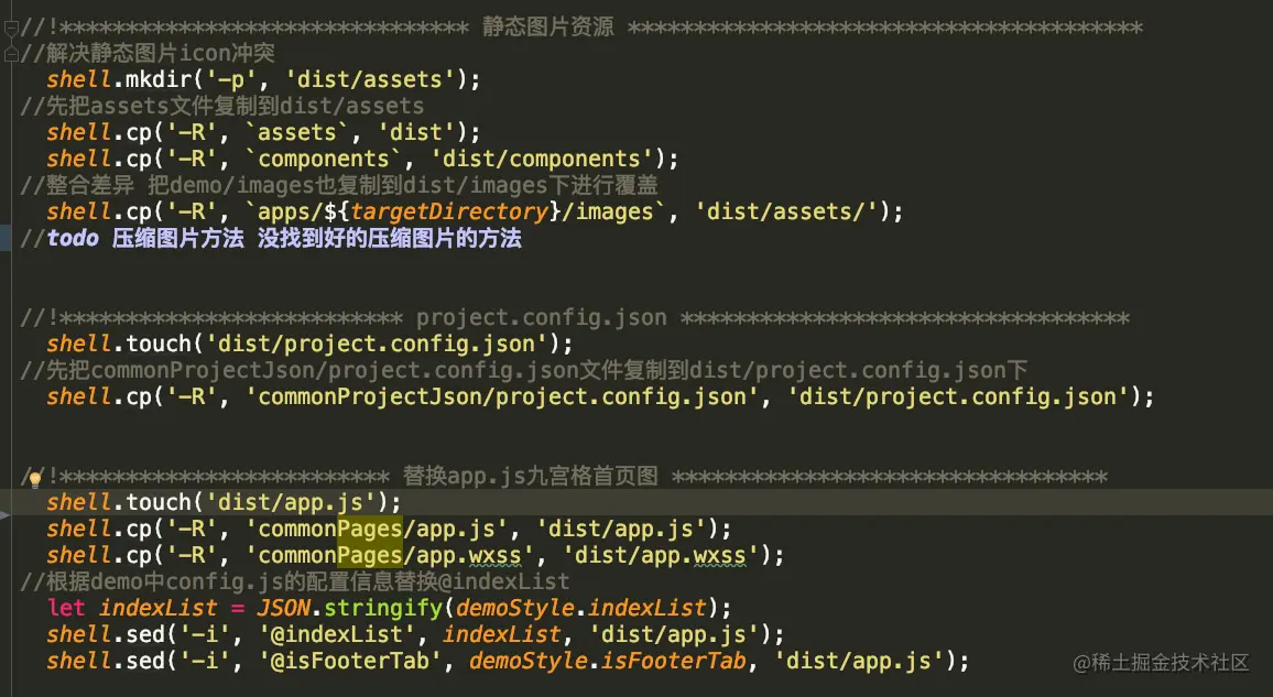 之前本来想到使用webpack的copy-webpack-plugin插件来移动目录到最终目录中,但是有很多需要替换的东西,比如小程序appId、图片、主题色、需要的模块拼接成app.json等等。后来想到了node的shell.js,可以使用此库来完成上述操作。