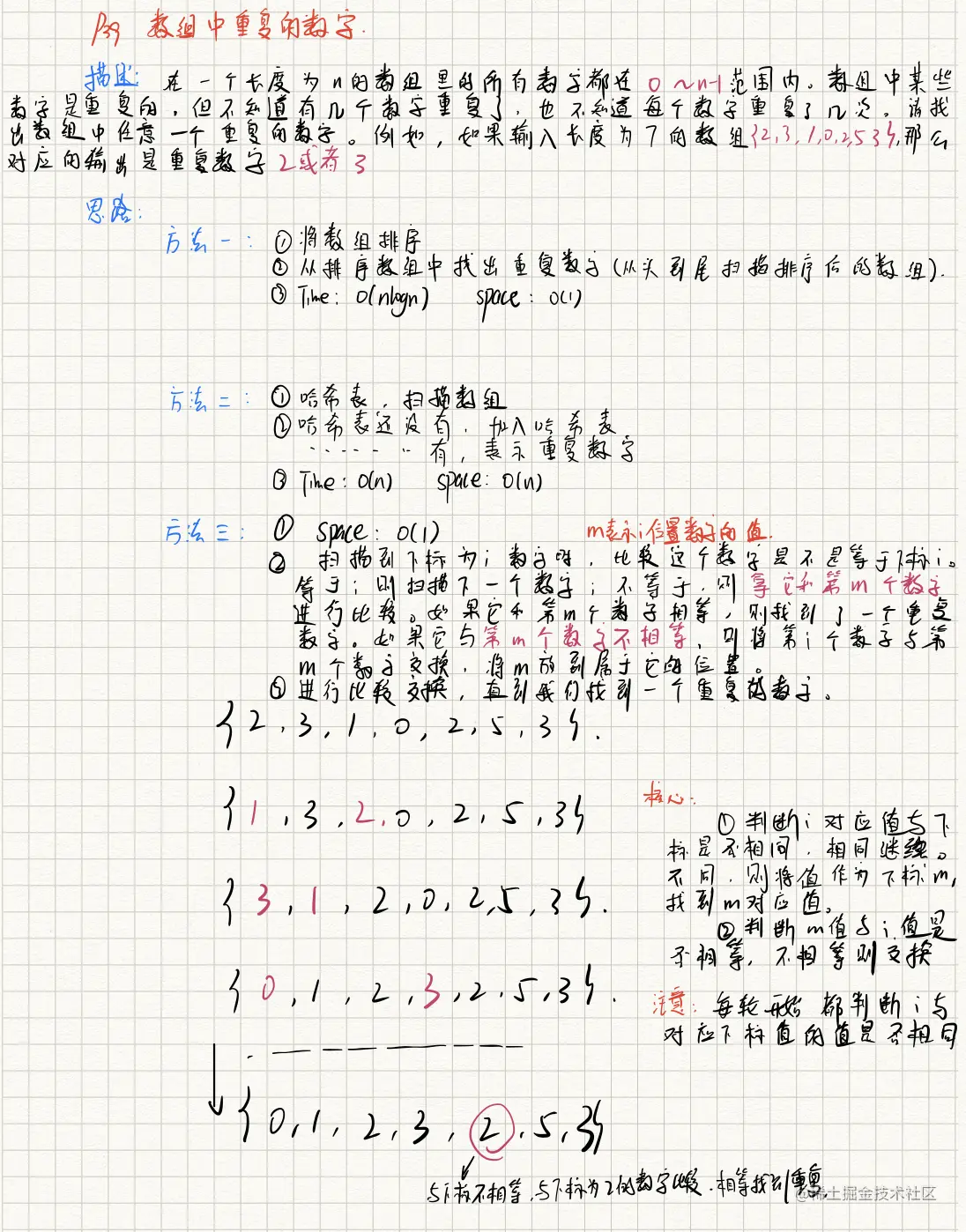 - 如果哈希表没有这数字,则加入哈希表。如果有,则找到了重复的数字。