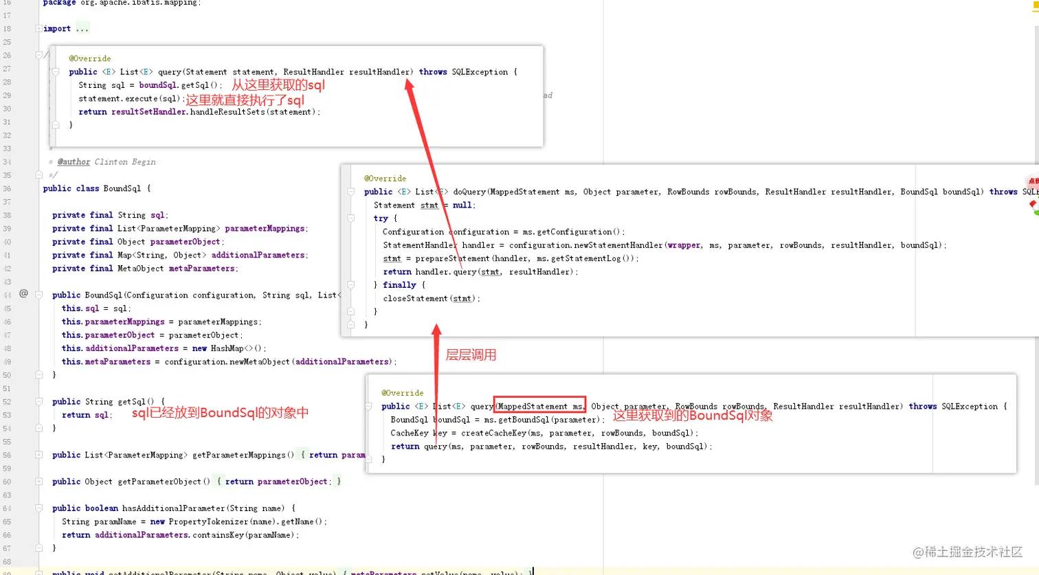 可以看到最后是通过BoundSql直接获取的sql,然后往前倒推最后发现是通过MappedStatement的getBoundSql方法返回的。MappedStatement在之前分析mapper的时候知道一个执行sql对应一个MappedStatement对象,它封装有mybatis中需要执行一条sql的所有信息,所以从这里获取也是理所应当的。