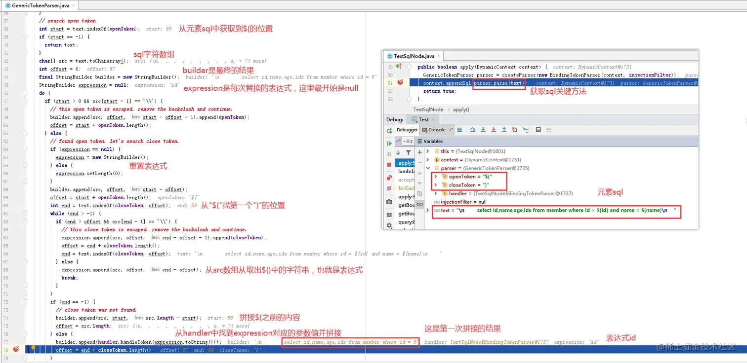 所以sql生成在GenericTokenParser的parse方法,parse方法的关键源码如上图左侧。主要步骤分析如下: