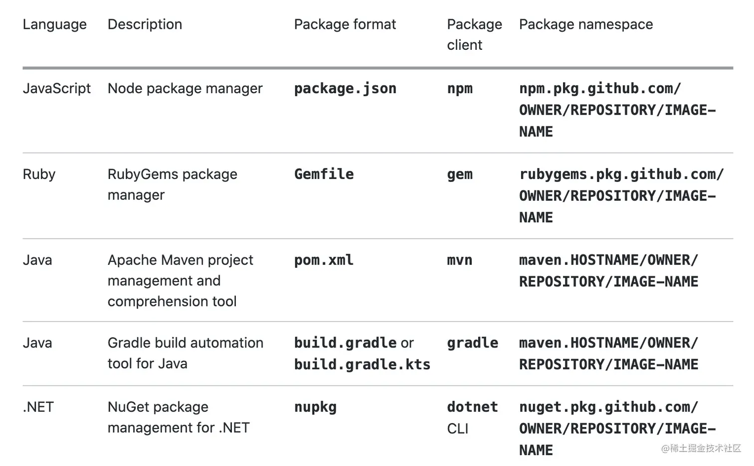 与专注于 NodeJS 包的 NPM 不同,GitHub 包注册中心支持一系列包类型和客户端,如下所示: