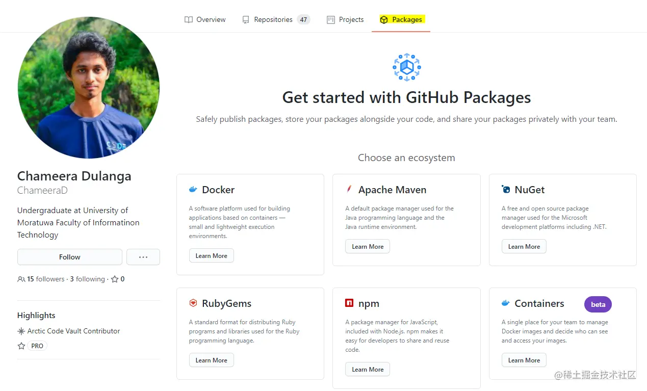 如果你是 GitHub 的 4000 万用户中的一员,只需点击你的 GitHub profile 或 GitHub Organization 下的一个标签就可以访问 GitHub 包管理服务。