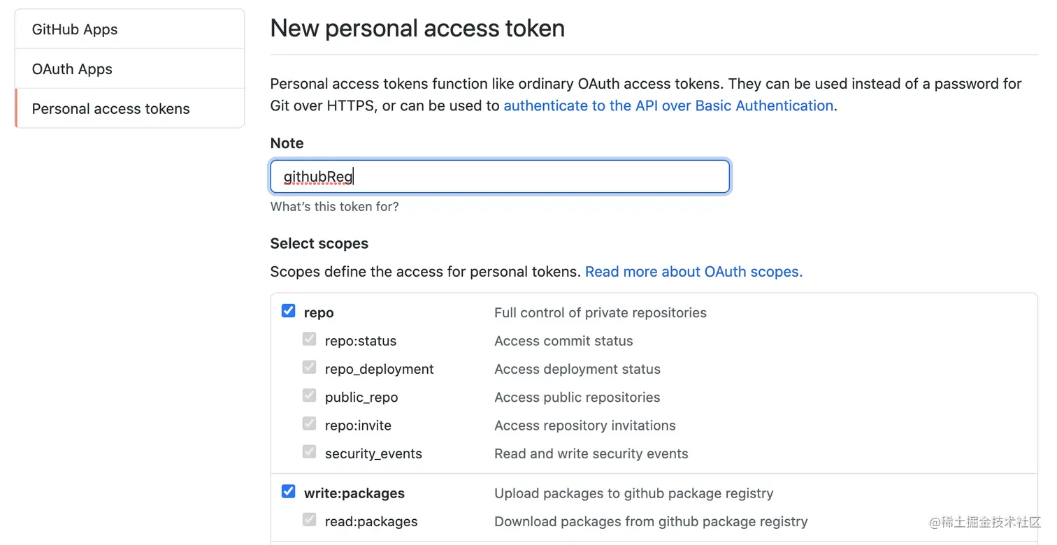 首先,你需要有一个 GitHub 访问令牌才能向 GitHub 注册表验证你的身份。你既可以使用现有的令牌,也可以使用 github.com/settings/to… 创建一个令牌。在这里,我将令牌命名为 githubReg。