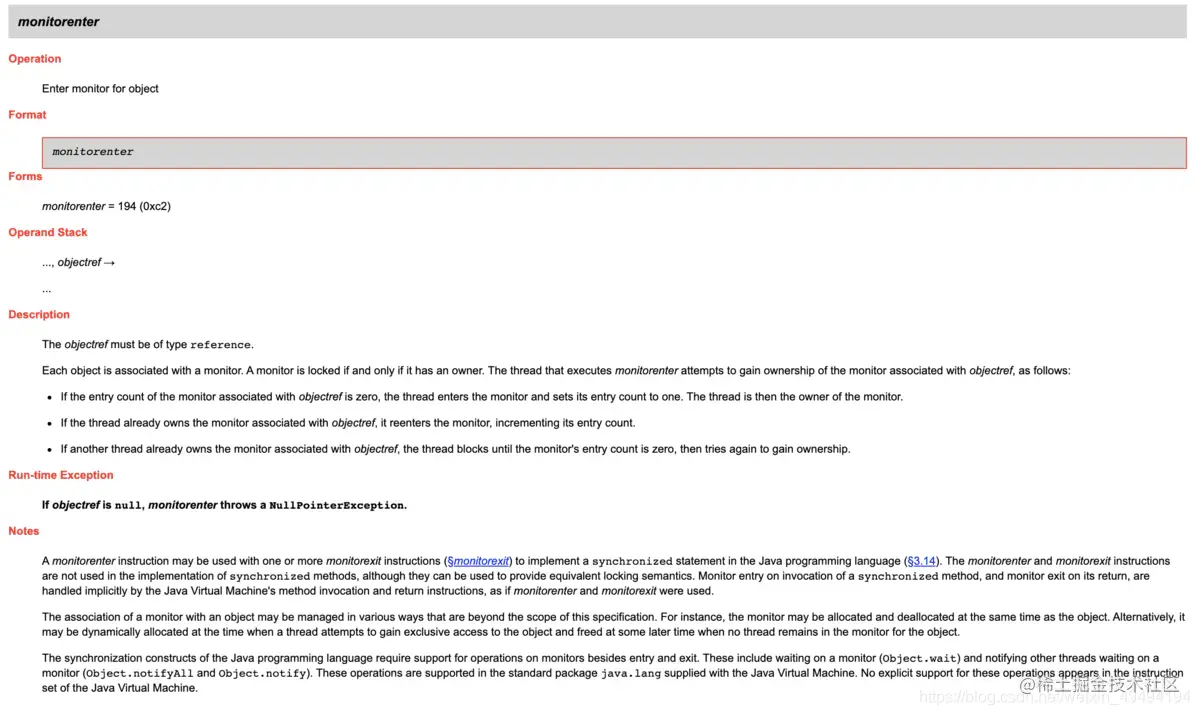 每个对象都与一个 monitor 相关联。当且仅当 monitor 对象有一个所有者时才会被锁定。执行 monitorenter 的线程试图获得与 objectref 关联的 monitor 的所有权,如下所示: