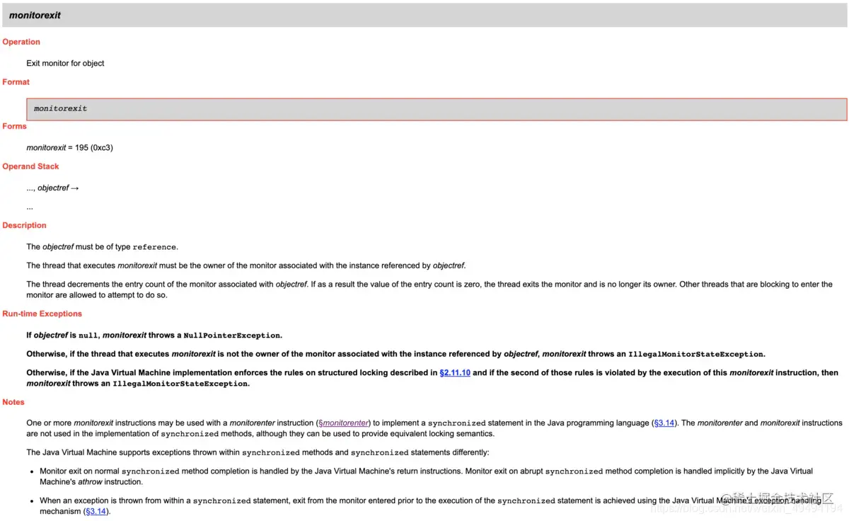 - 执行 monitorexit 的线程必须是与 objectref 引用的实例相关联的 monitor 的所有者。