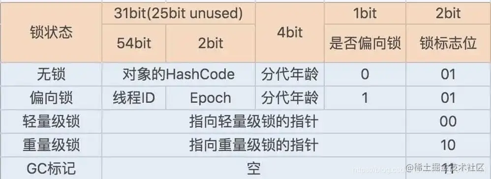 其中 Mark Word 记录了对象和锁有关的信息,在 64 位 JVM 中的长度是 64 位,具体信息如下图所示: