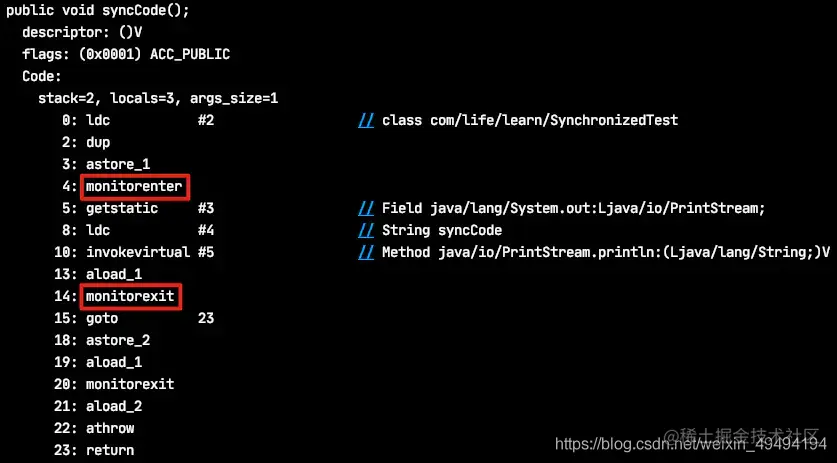 反编译的结果如下图所示,可以看到 syncCode 方法中包含 monitorenter 和 monitorexit 两个 JVM 指令。