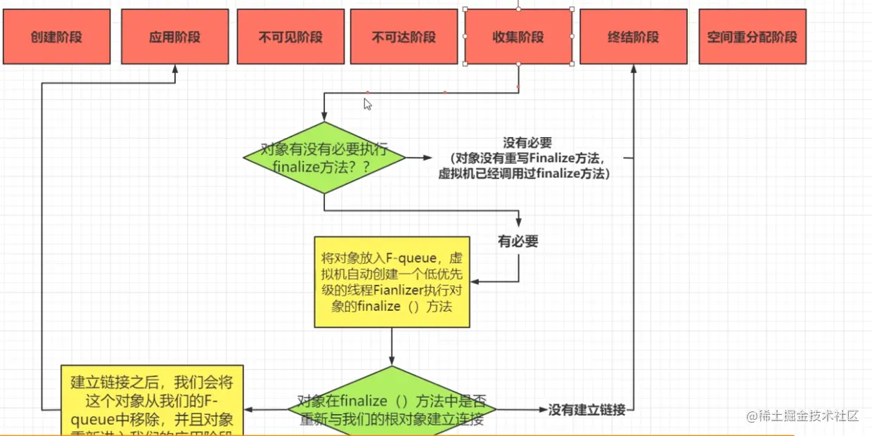 - 可达性分析算法:通过一系列的成为“GC Roots"的对象作为起始点,从这些节点开始向下搜索,搜索所走过的路径成为引用链,当一个对象到GC roots没有任何引用链相连时,则证明此对象是不可用的。