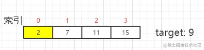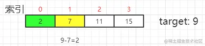 示例:nums = [2,7,11,15], target = 9