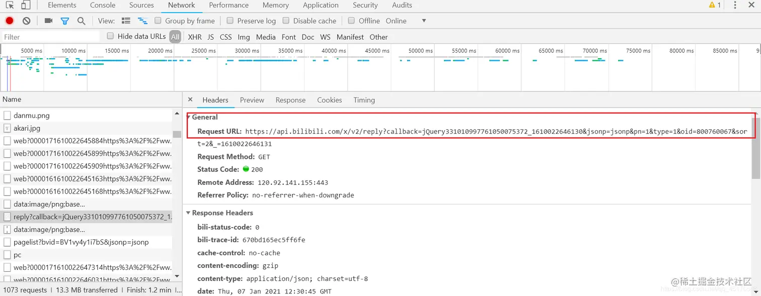 去掉第一个和最后一个参数可得评论URL,api.bilibili.com/x/v2/replyj….