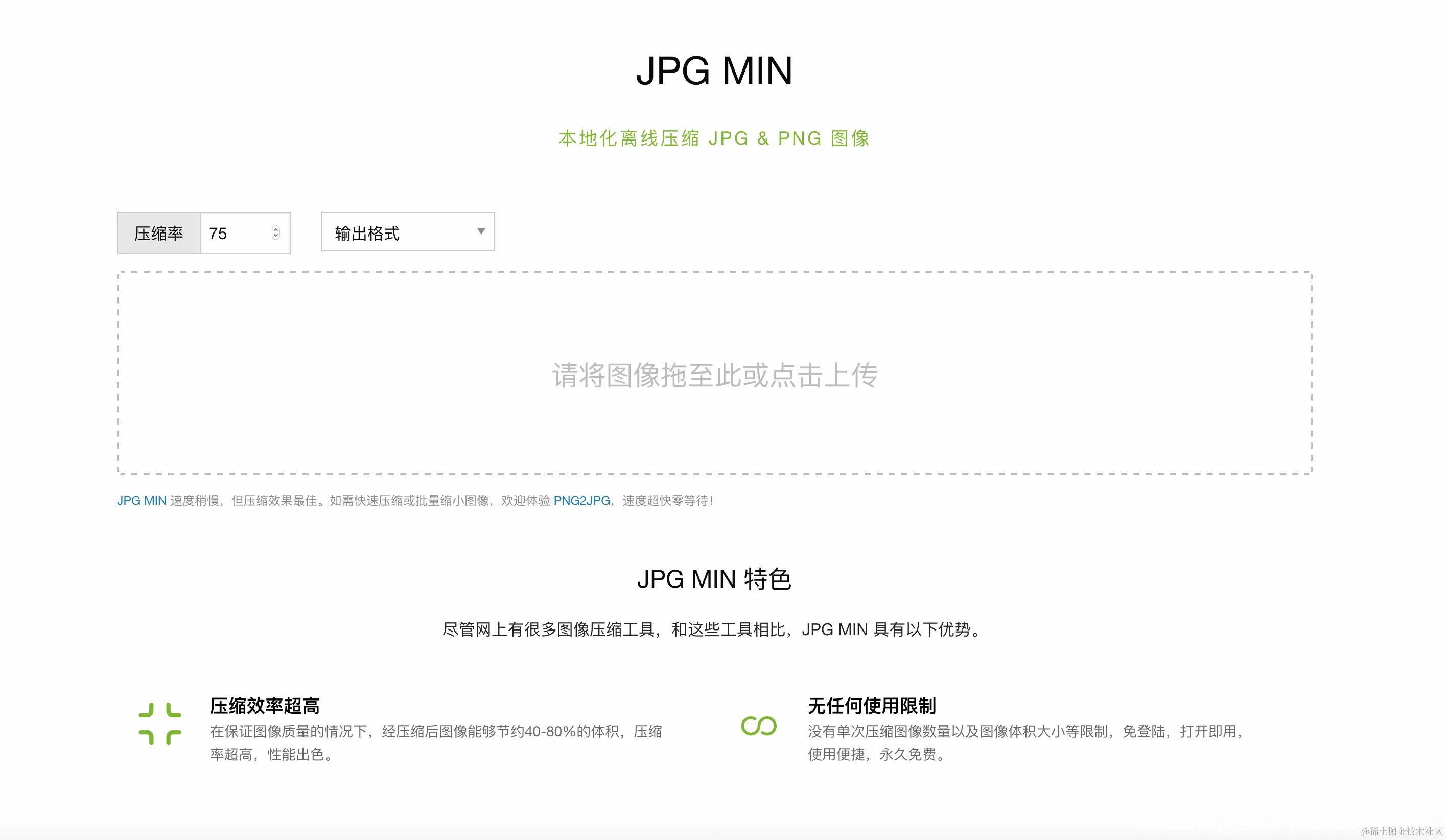 无需上传服务器,本地压缩,无大小,数量限制,支持JPG、PNG压缩,PNG支持良好,可自定义压缩参数。