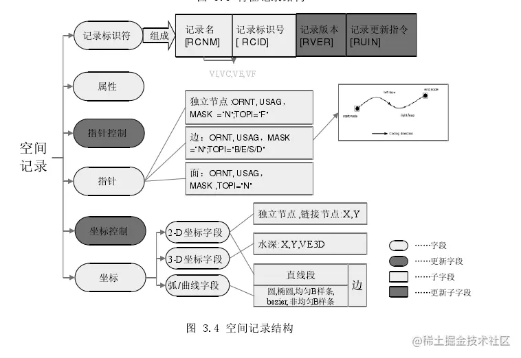 空间记录:记录了物标的位置数据信息。可以是矢量、栅格或矩阵类型,目前只有矢量型,其记录要包含与特征记录相关的几何坐标,空间属性,拓扑关系和改正指令,矢量记录可以是节点、边或面。 在对 S-57 数据进行解析时,特征记录和空间记录是一个海图源文件里出现最多的记录,也是包含重要数据的记录。下面的图分别给出了特征记录和空间记录的结构,关于更详细的信息请查阅 S-57 标准官方文档。有关S57标准文档的下载请前往电子海图研究中心。