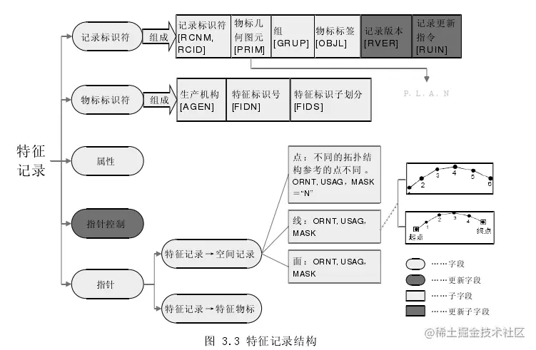 特征记录:特征记录包含非位置的真实世界数据。它们可以是元物标、制图物标、地理物标和关系物标,包括关系和更新指令的物标信息。