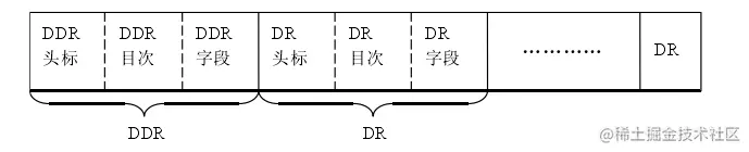 虽然 DDR 和 DR 的作用不同,但它们的结构是类似的,每一个逻辑记录(DDR 或 DR)都包含三个基本元素:头标区、目次区、字段区。