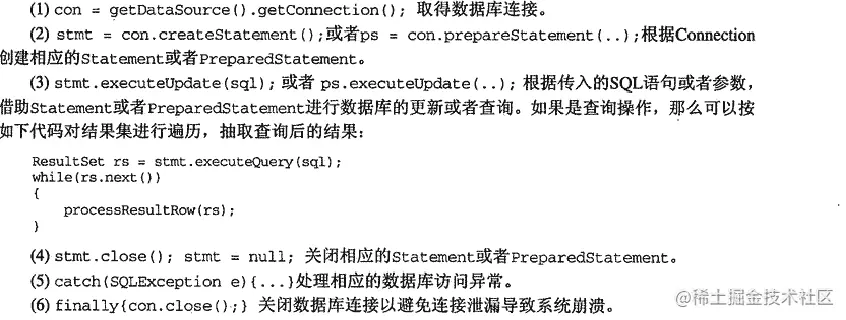 - 面向CallableStatement的模版方法,存储过程的访问。 在Connection的模版方法中,我们不是每次都要创建一个数据库连接,而是通一项数据库连接池的技术来完成的。 JDBC 2.0标准引入了dataSource作为数据库资源管理的标准,dataSource可以做到适配不同的数据库,以及数据库的连接数,释放等功能,任何的ORM框架都会与它集成的