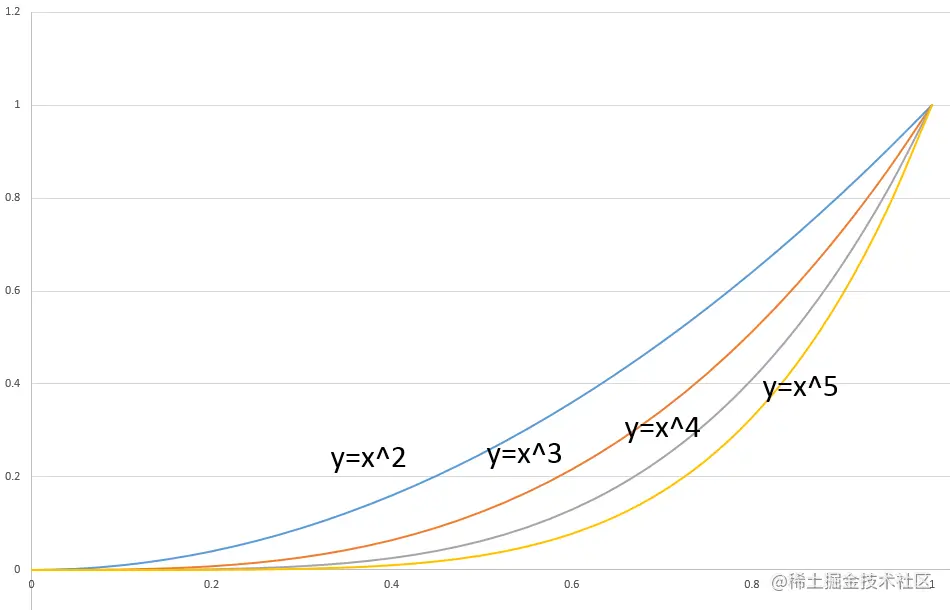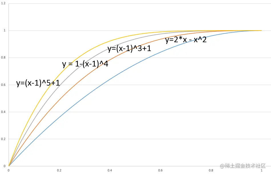 利用指数函数(x的n次方)可以构造一大堆easein的效果,再根据他们的轴对称或者中心对称做翻转和位移,又可以构造出其对应的easeout效果: