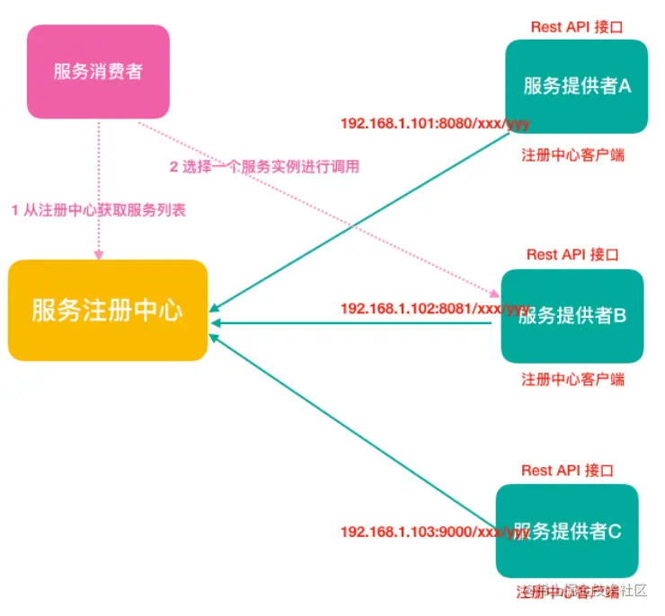 - 服务消费者想要某一个功能的时候,从注册中心获取服务列表