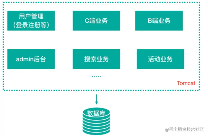 在诞⽣之初,拉勾的⽤户量、数据量规模都⽐较⼩,项⽬所有的功能模块都放在⼀个⼯程中编码、编译、打包并且部署在⼀个Tomcat容器中的架构模式就是单体应⽤架构,这样的架构既简单实 ⽤、便于维护,成本⼜低,成为了那个时代的主流架构⽅式