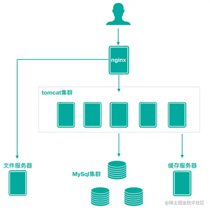 业务量上涨之后,单体应⽤架构进⼀步丰富变化,⽐如应⽤集群部署、使⽤Nginx进⾏负载均衡、增加缓存服务器、增加⽂件服务器、数据库集群并做读写分离等,通过以上措施增强应对⾼并发的能⼒、应对⼀定的复杂业务场景,但依然属于单体应⽤架构。