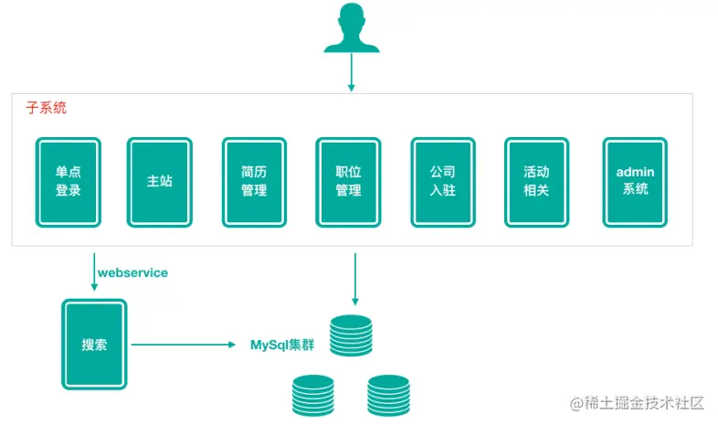 随着互联⽹的发展,⽤户群体逐渐扩⼤,⽹站的流量成倍增⻓,常规的单体架构已⽆法满⾜请求压⼒和业务的快速迭代,架构的变化势在必⾏。下⾯我们就以拉勾⽹的架构演进为例,从最开始的单体架构分析,⼀步步的到现在的微服务架构。