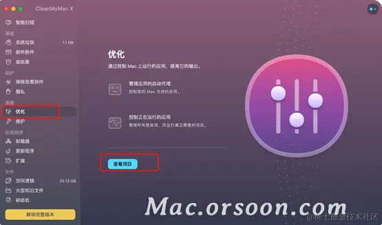 点击CleanMyMac左侧菜单的“优化项”,在右侧会出现具体的优化界面,如下图1。图1图片告诉我们,该优化选项,主要是用于管理应用的启动代理、帮助用户控制正在运行的应用,比如某些程序突然卡死的情况,就可以使用这个功能进行优化,平时也应该多使用此功能,减少无效的内存使用。