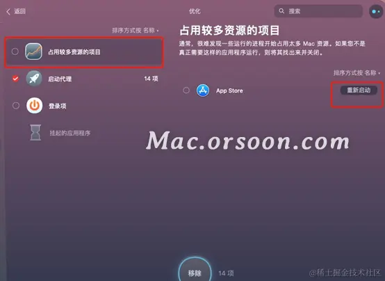 此时可以使用第三项:“占用较多资源的项目”,该项会帮助用户自动检测目前占用较多内存的应用程序,用户可以对暂时不需要用到的应用进行勾选,然后点击“移除”按钮,进行关闭。或者点击应用右侧的“重新启动”按钮,重新启动一次应用。