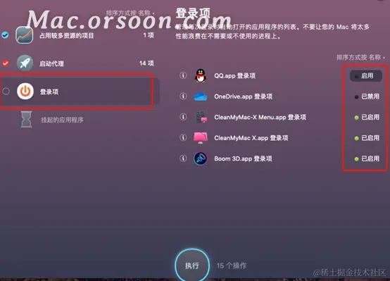 其中,点开“登录项”,可以对Mac开机自动启动的项目进行管理。对一些极少用到,不需要自动开机启动的项目,可以单击登录项右侧下图2红框的位置,切换其状态(已禁用、已启用),通过切换状态对其一键禁用或启用。