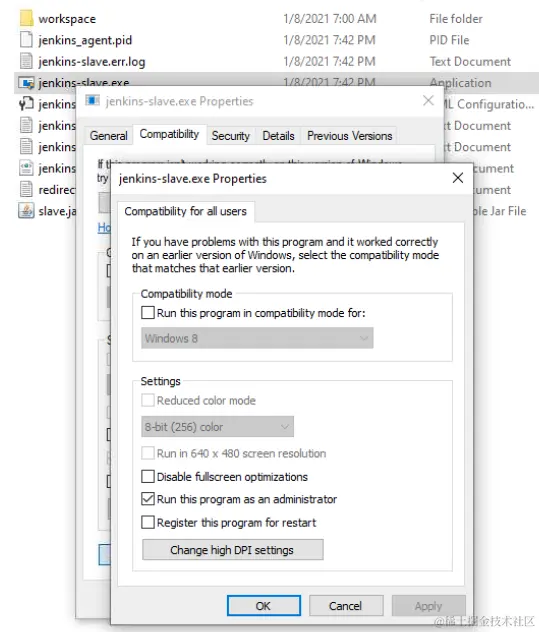 Windows 安装Jenkins agent service UserRunner 2021-01-09 160 阅读1分钟 在Jenkins中添加Node,设置如下图 到Windows中,安装firefox,Launch jnlp file 设置C:\jenkins\jenkins_slave.exe run as administrator 安装完成