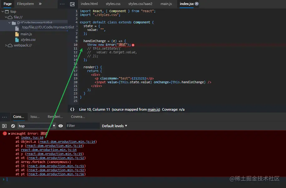 这时候打开 html 页面测试输入报错,可以看到已经成功定位到了源代码的错误点,OK!