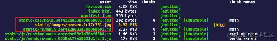 第一种[hash],需要注意的是它是根据模块 id 生成的,所以每个 chunk 得到的值都是一样的,在指定代码拆分以后,对其做了测试,可以看到两个 chunk 的 hash 都是一样的。