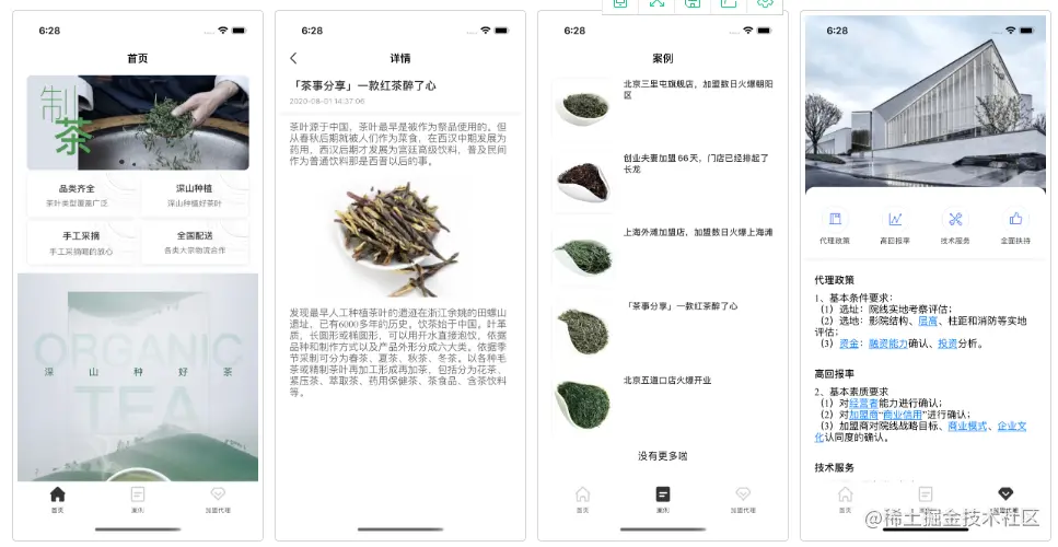 从上面的企业app开发效果图中我们可以看到”加盟代理“页面隐藏了导航栏,而其它页面没有隐藏。”加盟代理“页面路径为 pages/join/join.stml,我们参照微信小程序的语法,在同目录下放置了 join.json 文件,在里面配置 navigationStyle 字段为 custom。