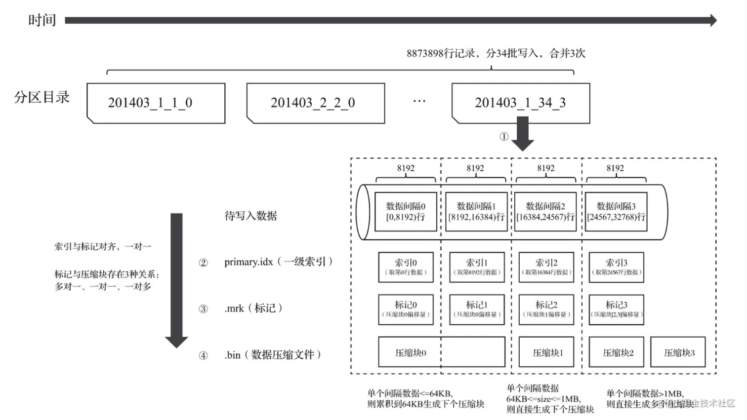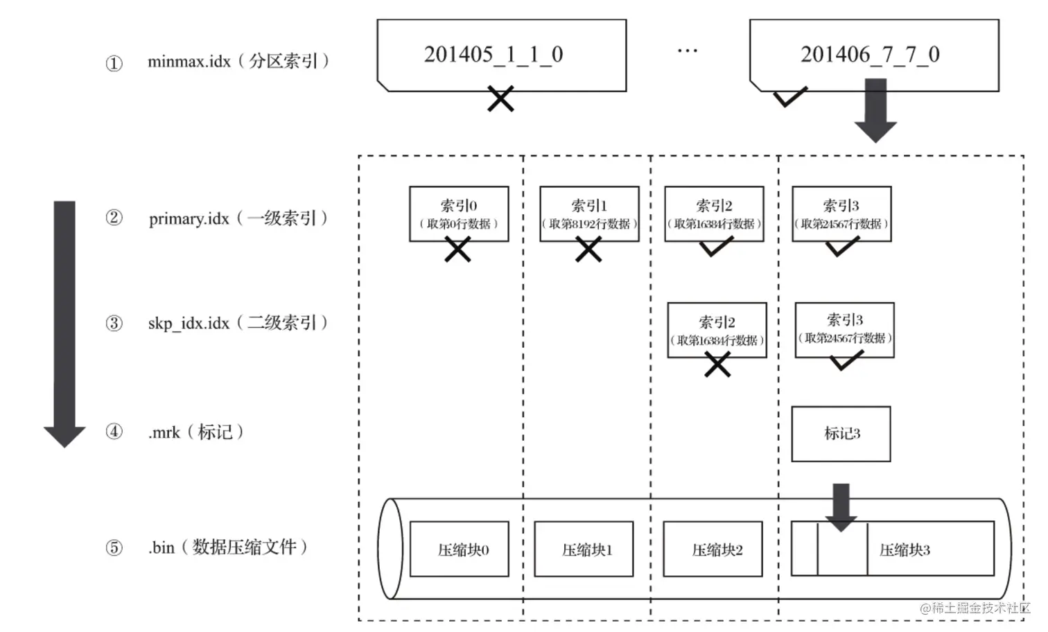 (8) partition.dat和minmax_[Column].idx:使用了分区键就会生成。partiton.dat记录当前分区下,分区表达式最终生成的值。minmax索引记录当前分区下分区字段对应原始数据的最大值和最小值。这样方便查询时,跳过不必要数据分区,减少需要扫描的范围。