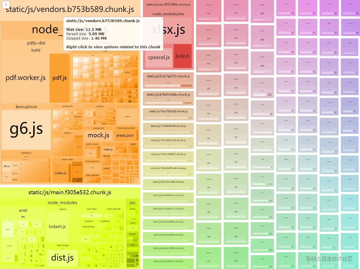 过去我做过的一个项目,大量使用第三方库,对于node_modules中的代码,如果按照 webpack 默认的配置将node_modules抽成一个 chunk,结果就像下图这样: