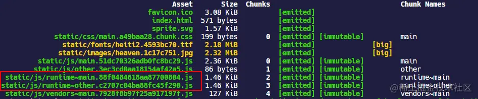 使用optimization.runtimeChunk可以将 webpack 的 runtime 代码在生产环境打包的时候拆分成一个单独的 chunk,最终生成的 runtime chunk 文件名会从output.filename提取生成。