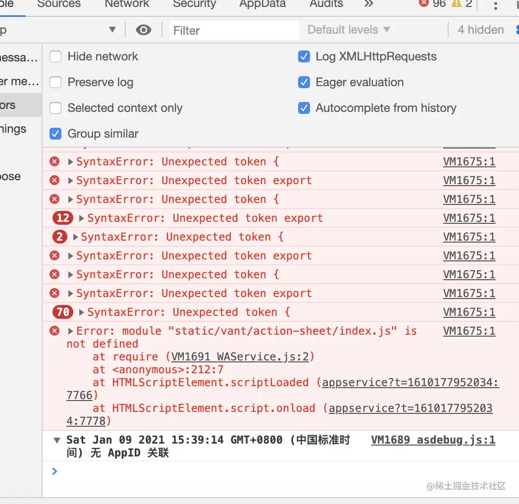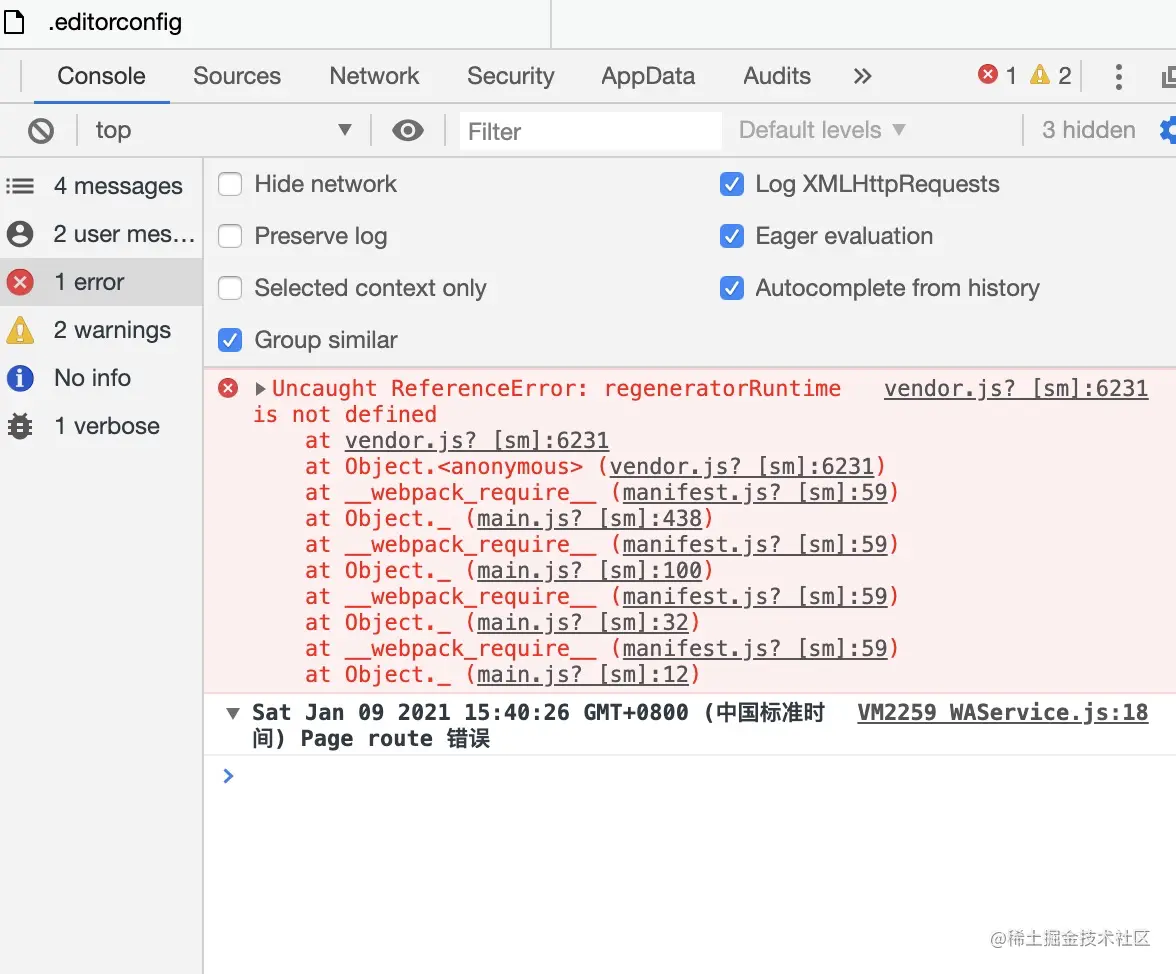 上面的报错,我之前一直切换不同的基础调试库,发现每个错误都不一样,但是最终都是一个问题,项目中我用到async 和 await,我的理解是这在开发者工具里面不认为是es6的东西而是es8,所以还是要调微信开发者工具的问题,所以钩上增强编译.