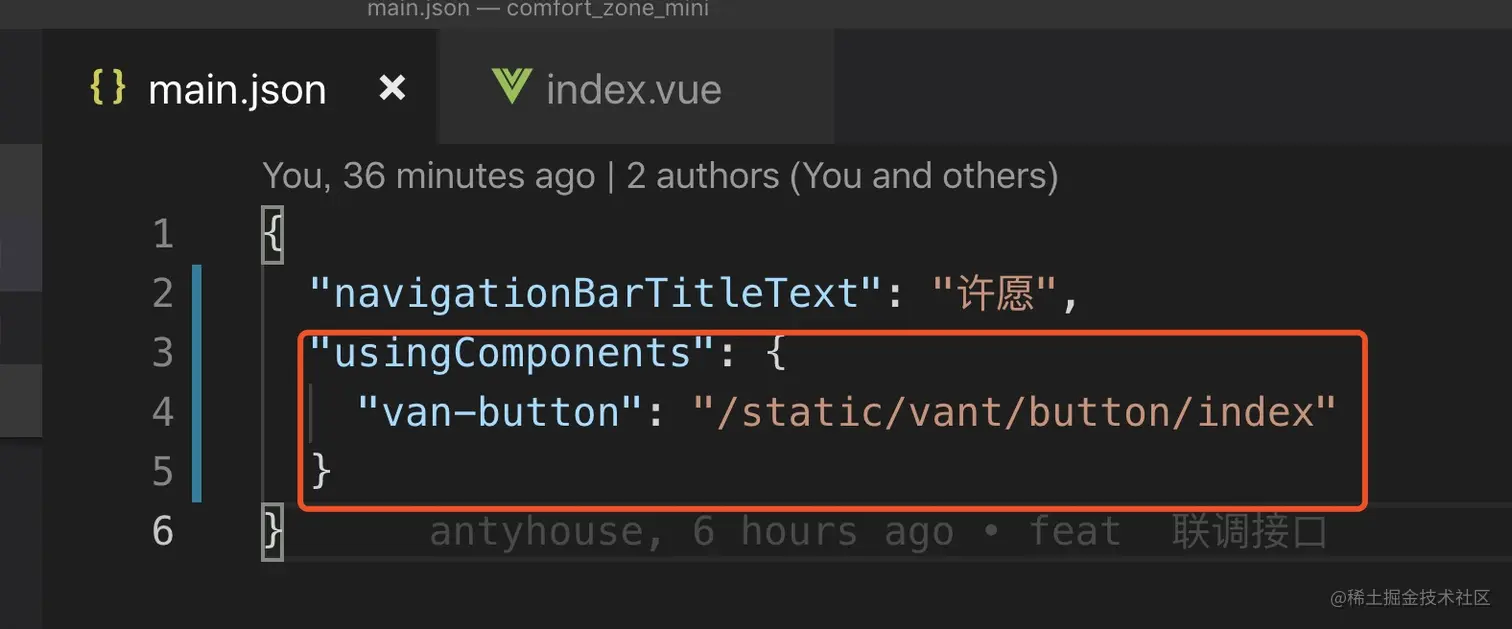 假如你要在哪个页面使用,每个模块都会有对应的main.json文件,这时候将刚刚在vant文件底下的组件引入,我这里如果想要引入button ui组件