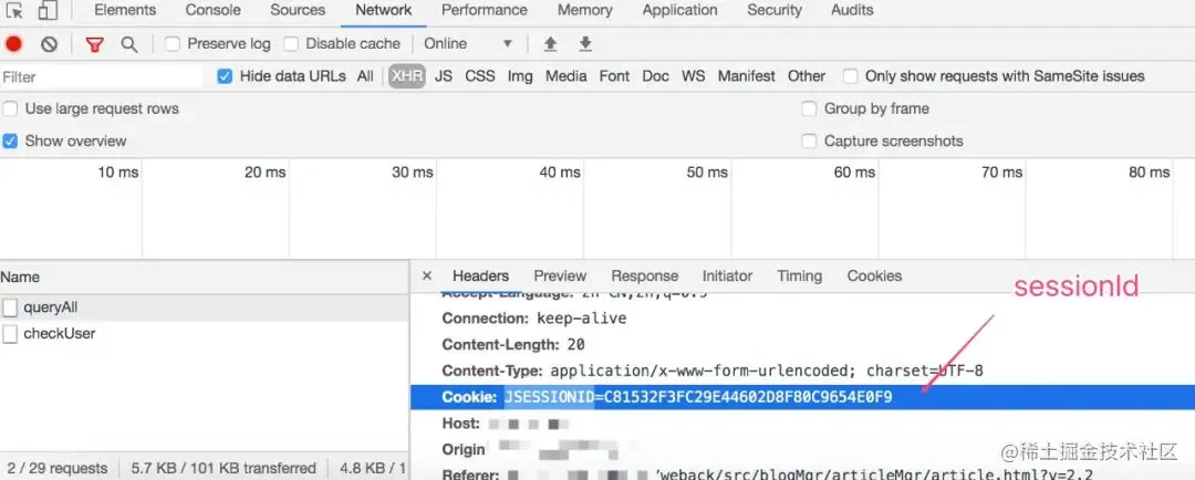 当浏览器再次发送请求时,会在请求头部的cookie中放入sessionId,将请求数据一并发送给服务器。