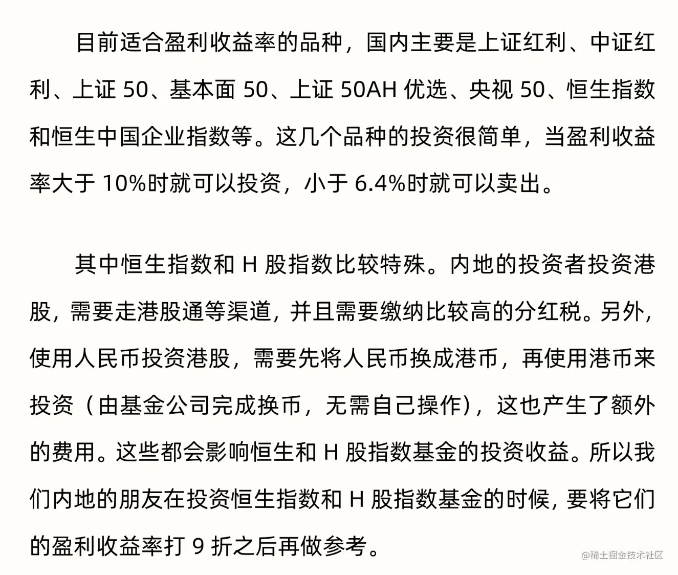 - 中证红利指数:从上交所和深交所挑选过去两年平均现金股息率最高的100只股票。从历史上看,它的历史收益比上证红利指数更好