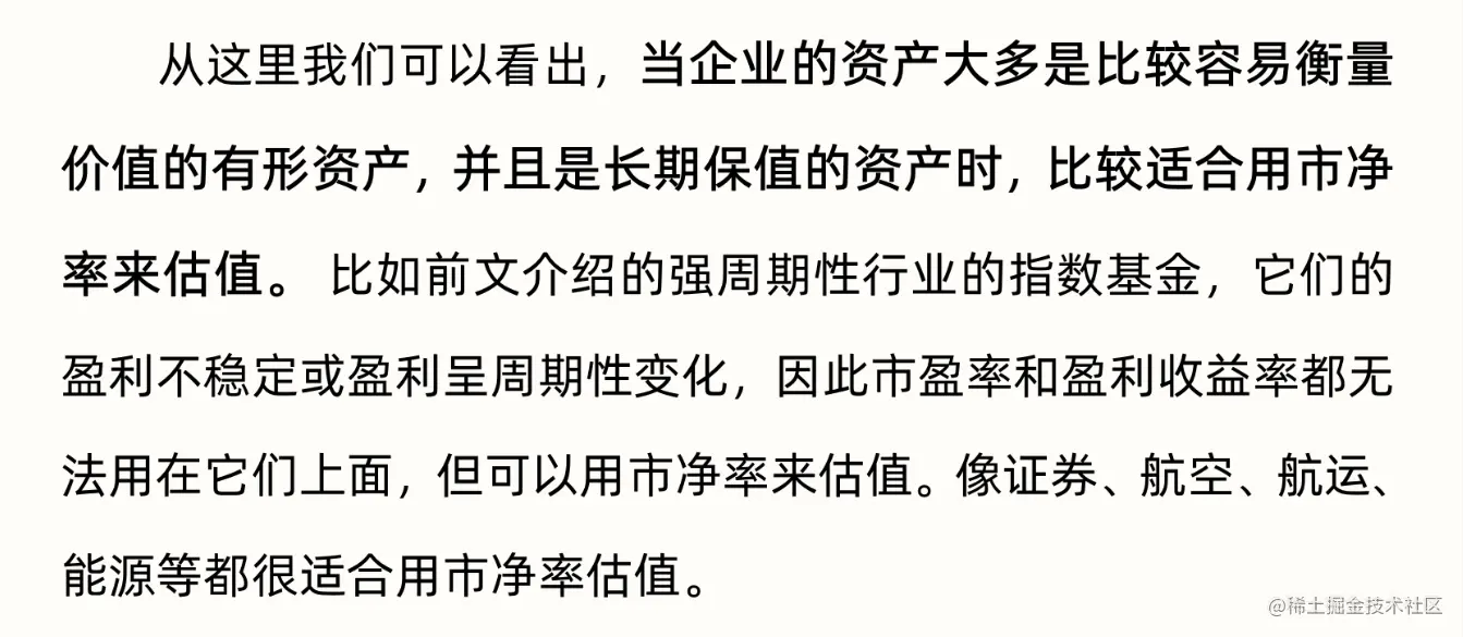 - 适用: 在遇到短期的经济危机,原本盈利稳定的宽基指数基金会在短期内盈利不稳定,也可以用市净率来辅助估值