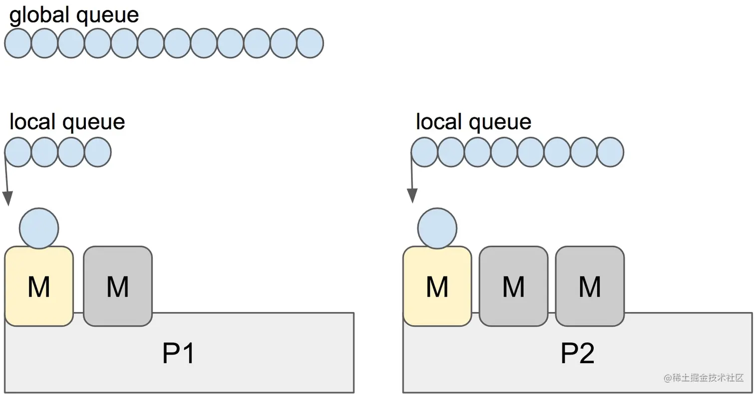 这里有一个特定的P的本地和全局goroutine队列。 每个M应该分配给一个P。Ps这时候可能没有Ms如果Ms被阻塞或处于系统调用中。 在任何时候,最多有GOMAXPROCS个P。在任何时候,每个P只能运行一个M。如果需要,调度程序可以创建更多M。