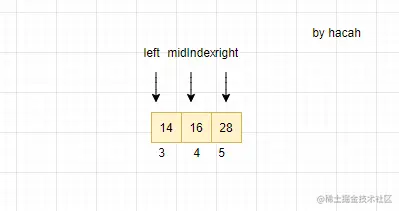 比较midIndex与我们要找的16,由于13小于16所以向左边寻找,就如下图。